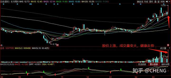 这里的成交量其实就是每天的成交额或者成交的总手数,代表着主力资金动态。量能变大,意味着主力资金交易活跃,而后续股价出现异动的概率就很高。而缩量就代表着主力资金活跃度不高,以散户交易为主,主力机构在看戏。
