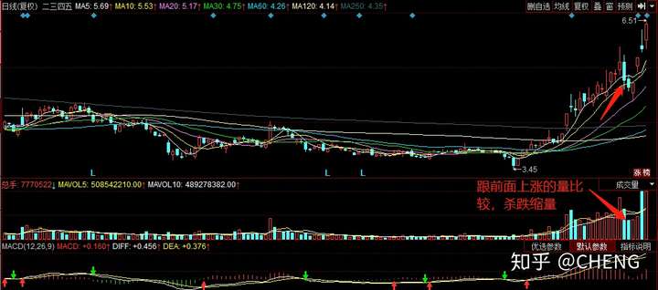 而下跌的话,要缩量才是比较好(踩踏式跌停除外),代表着机构资金没有出逃多少,而散户出逃厉害,这种情况强势股一般跌一个短线恐慌后,容易又给重新拉上去,借下跌完成一次洗盘(把散户吓得卖出持有的股票,而机构没有怎么卖)。例如下图二三四五,3月14,15号杀跌缩量,后续股价又被拉上去。